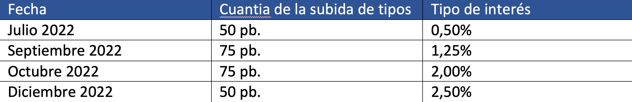De este modo las subidas de tipos de interés aplicadas durante el 2022, se detallan en la siguiente tabla: