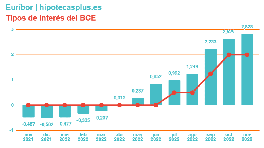 Como durante el 2022, el BCE ha decidido cuatro importantes subidas de tipo de interés, el Euribor ha hecho lo propio.