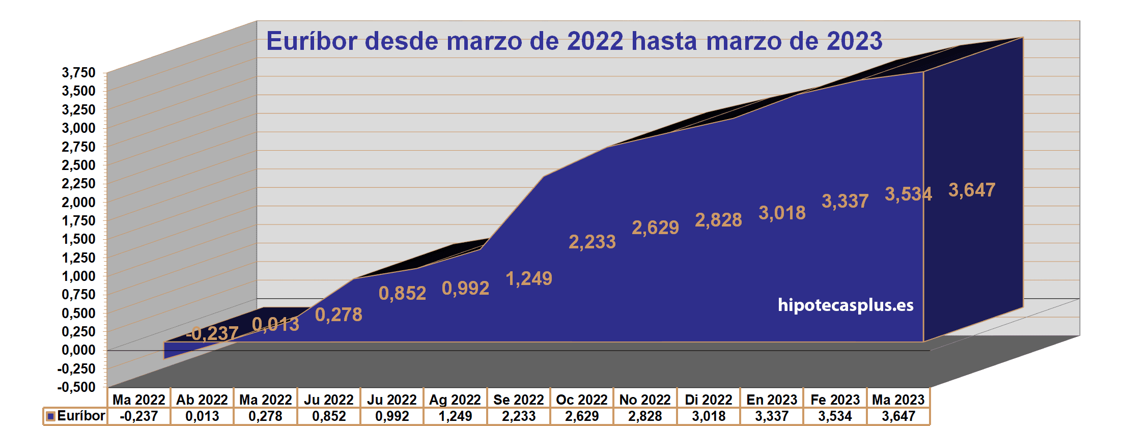 Tan solo se ha dado una subida de 113 milésimas, entre el valor del Euribor de febrero de 2023 (3,534%) y el Euribor actual de marzo de 2023 (3,645%).