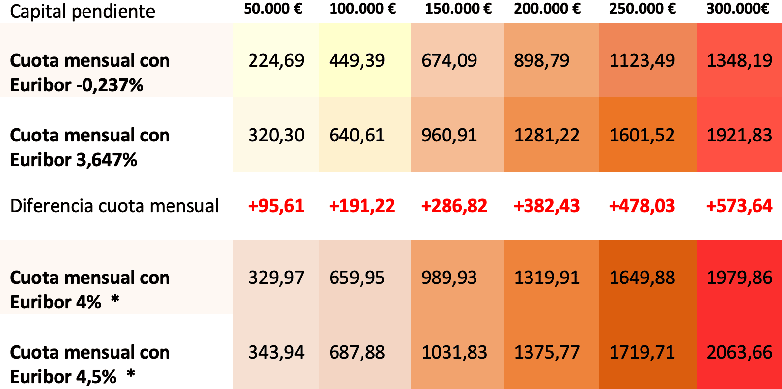 Las dos filas inferiores indican como se quedaría la cuota si el Euribor siguiera con su escalada y llegara al 4% y al 4,5%.