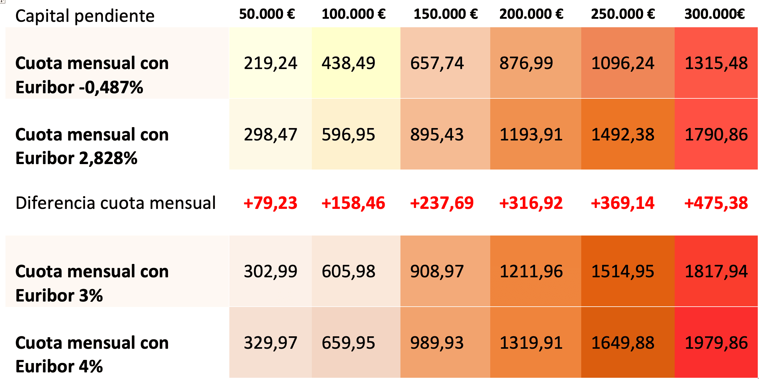A modo de resumen, indicamos que una hipoteca vinculada al Euribor con un capital pendiente de 100.000 €, con un diferencial sobre el Euribor del 1% y que se revise de modo anual con el dato de noviembre, pasará de una cuota de 438,49 euros a otra de 596,95 euros. Esto supone un encarecimiento mensual de 158,46 euros, o un encarecimiento anual de 1.901,52 euros. Estos datos son aproximados.
