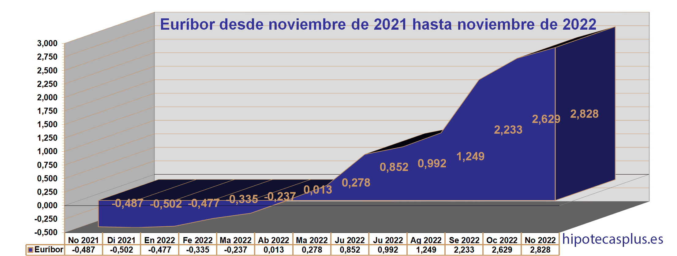 El Euríbor sigue ascendiendo en sus valores y cierra el mes de noviembre de 2022 en el 2,828%.