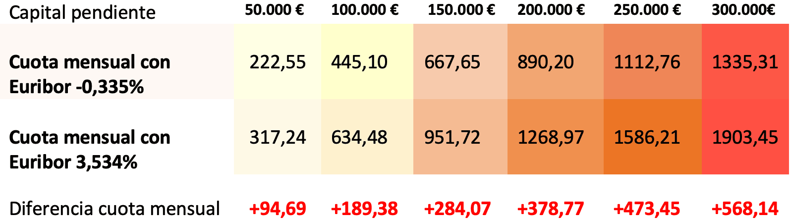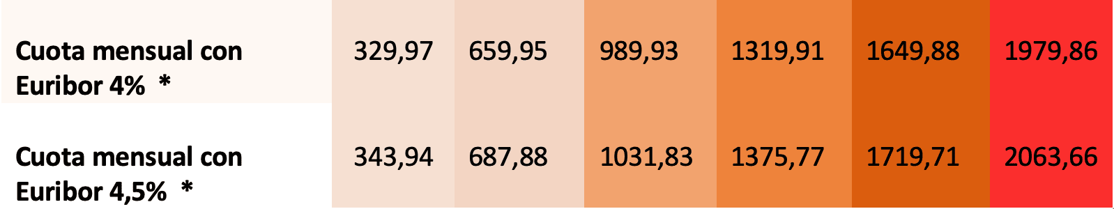 Las dos filas inferiores indican como se quedaría la cuota si el Euribor siguiera con su escalada y llegara al 4% y al 4,5%.