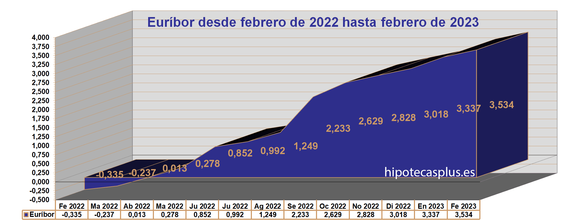 El Euríbor ha terminado febrero de 2023 en el 3,534%, lo que significa su decimocuarta subida consecutiva de su valor.