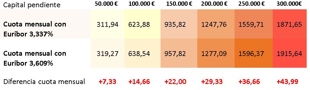 Una hipoteca con un capital pendiente de 100.000 € con un plazo restante de 20 años y con un tipo de interés de Euribor + 1% de diferencial, pasará con el nuevo valor del Euribor de una cuota mensual de 623,88€ a otra cuota de 638,54 €. Esto significa un incremento mensual de la cuota de 14,66 €. Todos los datos anteriores son aproximados.