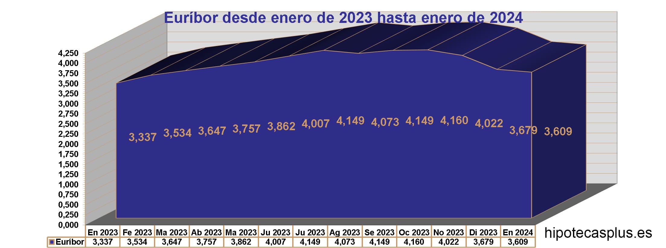 El Euribor continua su senda bajista y por tercer mes consecutivo retrocede. Cierra el mes de enero de 2024 en el 3,609%. Y no va a ser su último retroceso ni mucho menos. Estamos convencidos de que el índice hipotecario por excelencia va a continuar retrocediendo y muy pronto, quizás para febrero abarate las hipotecas con revisión anual con los datos del Euribor de dicho mes.