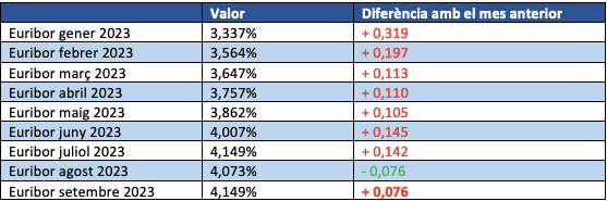 El que provoca un encariment de les hipoteques a interès variable que es revisin trimestral, semestral o anualment, amb la nova dada de l’Euribor de setembre, és el valor més baix que tenia l’Euribor fa 3, 6 o 12 mesos respectivament.