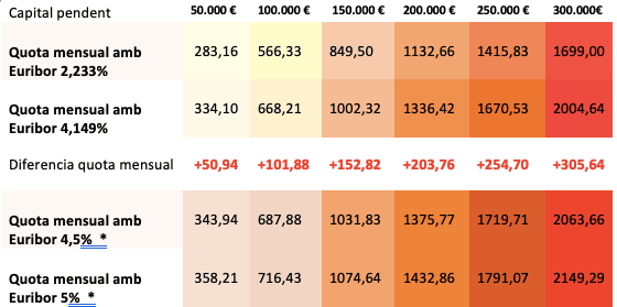 Les dues files següents mostren quant pujarà la hipoteca, si l’Euribor arribés al 4,5% o al 5%. Esperem que no ho faci.