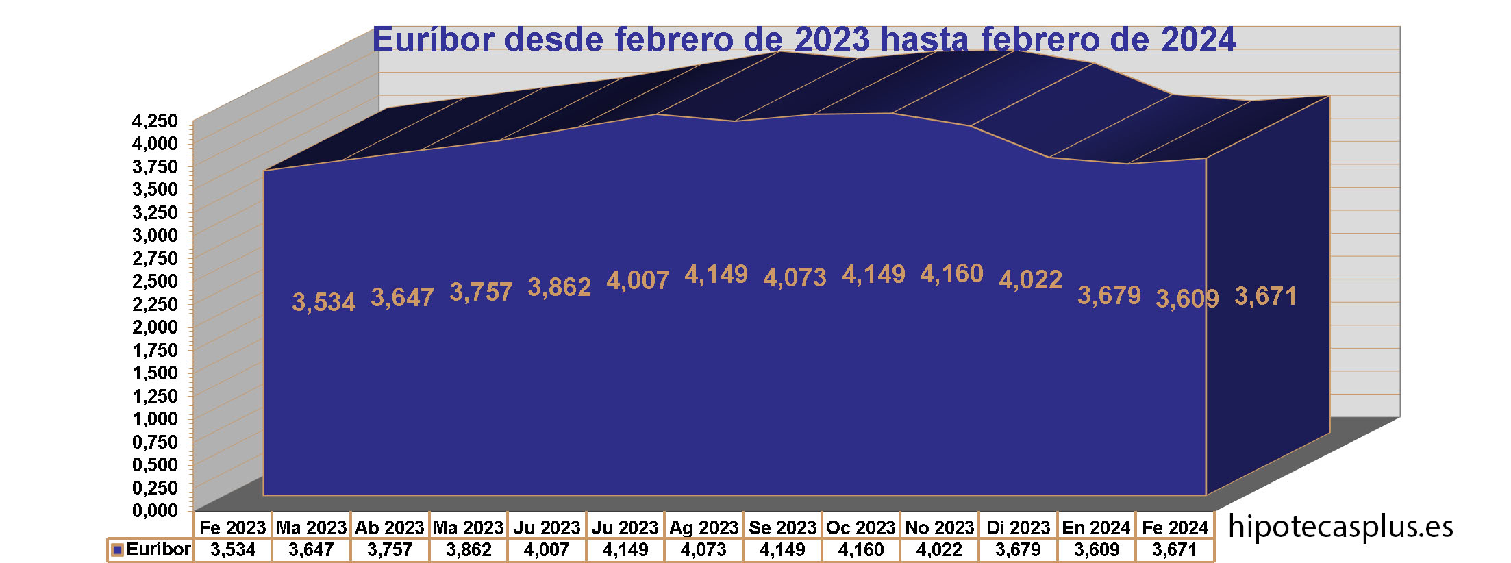 A continuació, us presentem com queden les hipoteques després de la nova dada de l’Euríbor. Prendrem com a referència l’Euríbor de febrer de 2023, que va ser del 3,564%, i l’Euríbor de febrer de 2024, que s’ha quedat en el 3,671%.