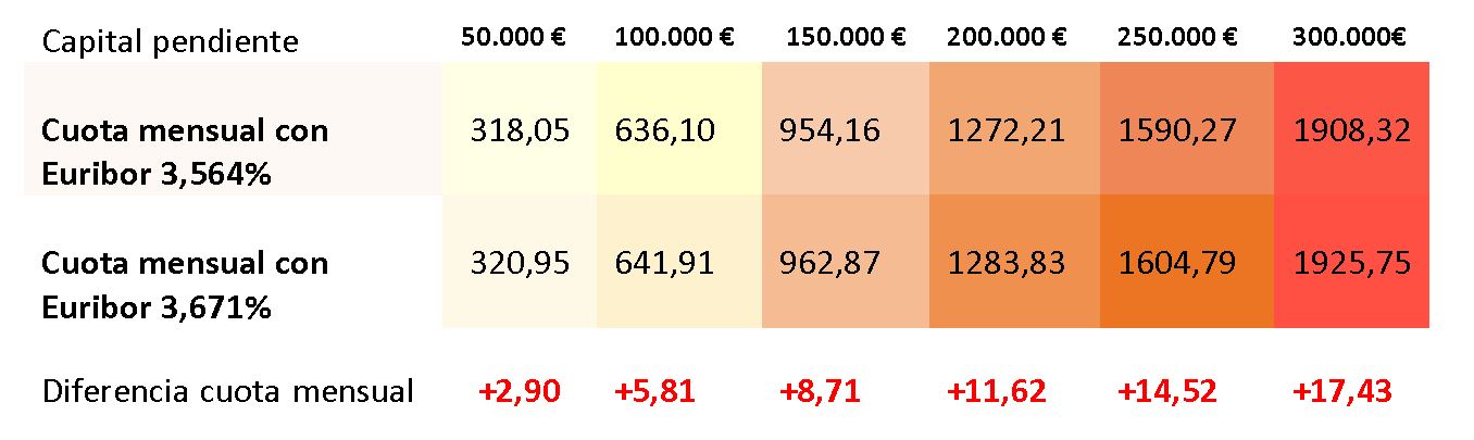 Una hipoteca amb un capital pendent de 100.000 € amb un termini restant de 20 anys i amb un tipus d’interès de l’Euríbor + 1% de diferencial, passarà amb el nou valor de l’Euríbor d’una quota mensual de 636,10 € a una altra quota de 641,91 €. Això significa un augment mensual de la quota de 5,81 €. Totes les dades anteriors són aproximades.