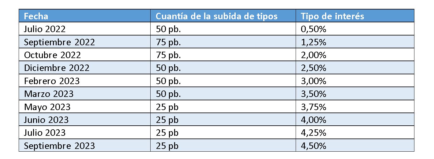 Per tant, encara trigarem a publicar una nova línia amb un retall de tipus d’interès a la següent taula, que mostra les últimes 10 pujades de tipus d’interès que ha aplicat el BCE per lluitar contra la inflació, que es va desbordar després de la Covid-19 i de l’esclat de la guerra a Ucraïna: