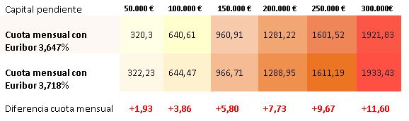 Una hipoteca amb un capital pendent de 100.000 € amb un termini restant de 20 anys i amb un tipus d’interès d’Euribor + 1% de diferencial, passarà amb el nou valor de l’Euribor d’una quota mensual de 640,61€ a una altra quota de 644,47 €. Això es tradueix en un increment mensual de la quota de 3,86 €. Totes les dades anteriors són aproximades.