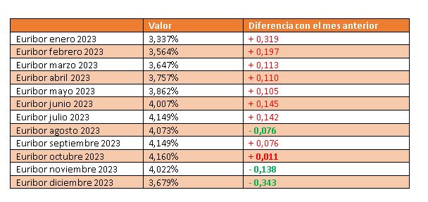 As we mentioned last month, we observed in the previous table that the decline in November was more pronounced than in August. We indicated that this was a sign of hope, and indeed it has been: it was a prediction of a further decline to conclude 2023, with a decrease of 0.343 points in the Euribor value.