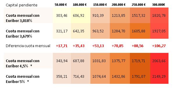 The middle row indicates the increases that the mortgage installments will experience with the new Euribor value.